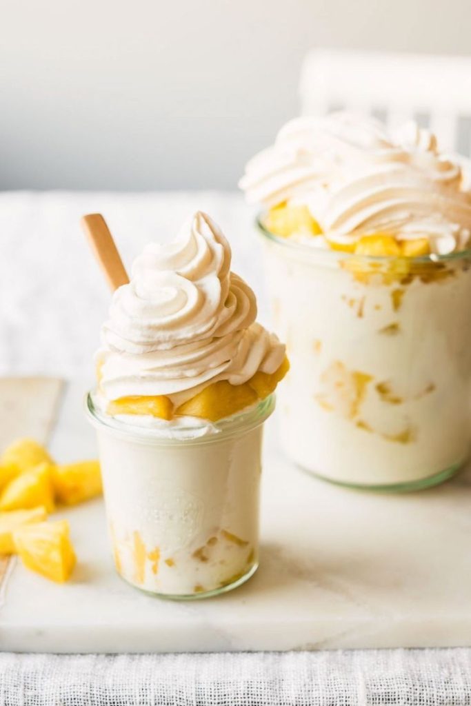 ඩෙසර්ට් කප් ගෙන කලින් සකස් කරගත් විපින් ක්රීම් මිශ්රණයෙන් ස්වල්පයක් එකතු කර ගන්න.ඉන්පසුව ඒ මතට කලින් සදා ගත් අන්නාසි මිශ්රණය එකතු කර ගන්න. නැවත විප් ක්රීම් මිශ්රණයෙන් තවත් තට්ටුවක් දා ගන්න.