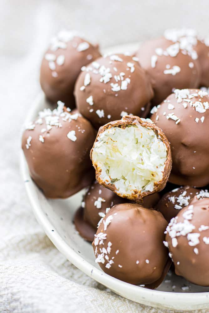 පොල් ටික පෑන් එකකට දමා වතුර ගතිය යන තුරු යන්තම් බැදගන්න. ඊටම මිල්ක්මේඩ් එක එකතු කර එක ගුලියක් වන තුරු රත් කර ගන්න. ඉක්මනින් ලිපෙන් ඉවතට ගෙන කුඩා බෝල සකසා ගන්න. චොකලට් ඩබල් බොයිල් ක්‍රමයට උණු කර කලින් සකසා ගත් coconut balls චොකලට් වල තවරා ගන්න. තරමක් සවි වන තුරු ශීතකරණයක තබාගන්න.