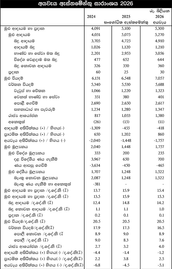 2026 මූල්‍ය වර්ෂය සඳහා විසර්ජන පනත් කෙටුම්පතෙහි ණය ගැනීමේ සීමාව ඇමුණුම II හි ඉදිරිපත් කර තිබෙනවා. අදාළ වියදම් පියවර පිළිබඳ තාක්ෂණික සටහන ඇමුණුම III හි දක්වා තිබෙනවා. තවද, 2024 අංක 44 දරන රාජ්‍ය මූල්‍ය කළමනාකරණ පනත යටතේ අයවැය දෙවන වර කියවීම සමග ඉදිරිපත් කළ යුතු ලේඛන ද සභාගත කර තිබෙනවා.