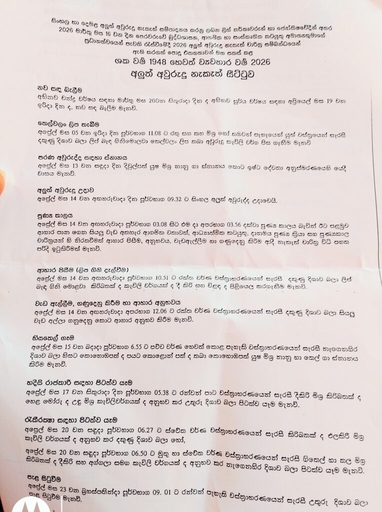 2026 අලුත් අවුරුදු නැකැත් සීට්ටුව, බුද්ධශාසන, ආගමික හා සංස්කෘතික කටයුතු අමාත්‍යාංශය විසින් එළි දක්වා ඇත.