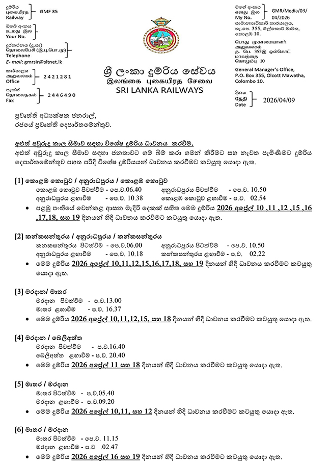 එළඹෙන අලුත් අවුරුදු සමයේ ගම්බිම් බලා යන සහ එන මගීන් වෙනුවෙන් විශේෂ දුම්රිය කිහිපයක් එක් කර තිබේ.