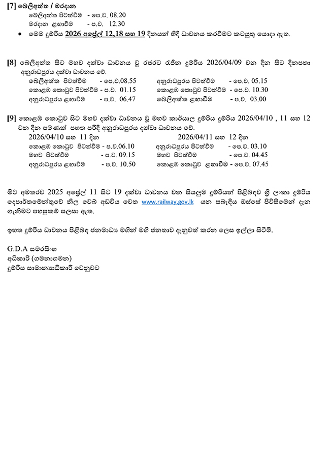 අප්රේල් මස 11 වනදා සිට 19 වනදා දක්වා කොළඹ සිට පිට පළාත් බලා යන මගීන් සඳහා දුම්රිය ධාවනය කෙරෙන බව දුම්රිය දෙපාර්තමේන්තුව දැනුම්දෙයි.