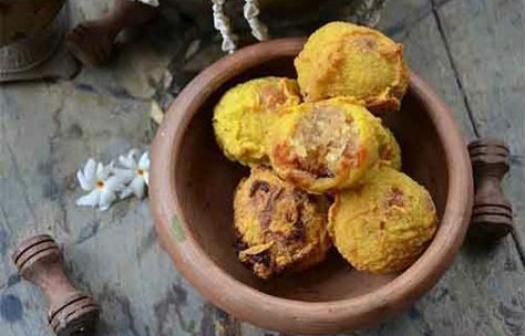 තවත් හාල්පිටි කෝප්පයකට කහ කුඩු හා ලුණු ස්වල්පයක් මිශ්ර කර බැටරයක් සදා කලින් සදාගත් බෝල එහි ගිල්වා ගැඹුරු තෙලෙහි බැදගන්න.