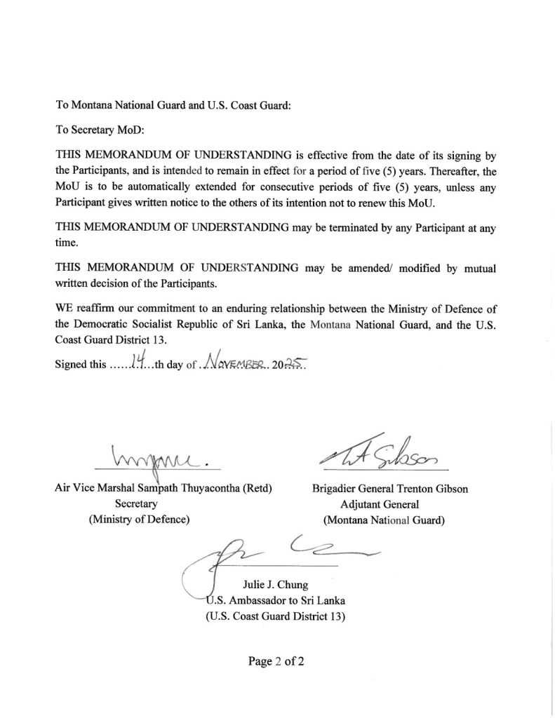 රාජ්ය හවුල්කාරීත්ව වැඩසටහන යටතේ ඇමෙරිකාවේ මොන්ටානා ජාතික ආරක්ෂක බළකාය ශ්රී ලංකා සන්නද්ධ හමුදා සමඟ අවබෝධතා ගිවිසුමක් අත්සන් කරනු ලැබුවේ පසුගිය 14 වැනිදාය . කොළඹ ඇමෙරිකානු තානාපති කාර්යාලය පැවසුවේ, මෙමගින් ඉන්දු-පැසිෆික් කලාපයේ සාමය, ආරක්ෂාව සහ ආපදා ප්රතිචාර දැක්වීම වැඩිදියුණු කරමින් එක්සත් ජනපදය සහ ශ්රී ලංකාව ආරක්ෂක සහයෝගිතාව වඩාත් විධිමත් කරනු ලැබූ බවයි.
