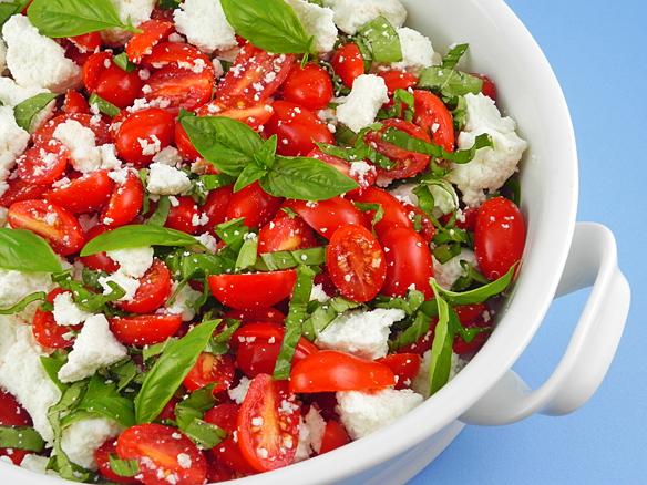 හොඳින් ඉදුණු තක්කාලිවල මදය ඉවත්කර කුඩා කැබලි වලට කපාගන්නකපාගත් බෙල් පෙපර්මොසරැල්ලා චීස් සහ තක්කාලි හොඳින් කලවම් කර dressing එකද එයට එකතු කරන්නඉන්පසු පිඟානක් ගෙන සාදාගත් සලාදය ඒ මත අතුරා පිළිගන්වන්න.