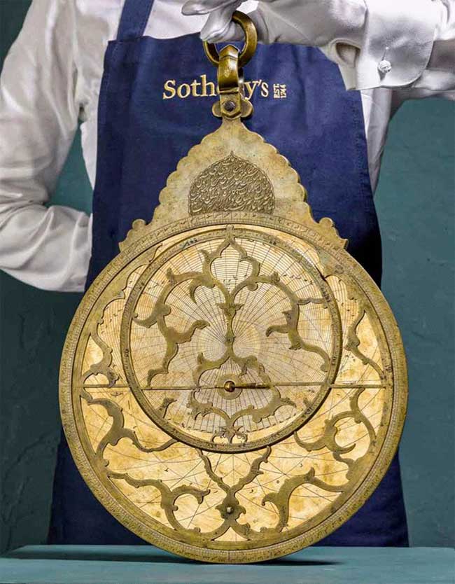 පිත්තලෙන් නිමවා ඇති මෙම උපකරණය ලොව දැනට පවතින විශාලතම ඇස්ට්‍රොලේබ් උපකරණය විය හැකි බවත්, එය මීට පෙර කිසි දිනක ප්‍රදර්ශනය කර නොමැති බවත් Sotheby’s ආයතනයේ ඉස්ලාමීය සහ ඉන්දියානු කලා අංශයේ ප්‍රධානී බෙනඩික්ට් කාටර් පවසයි.