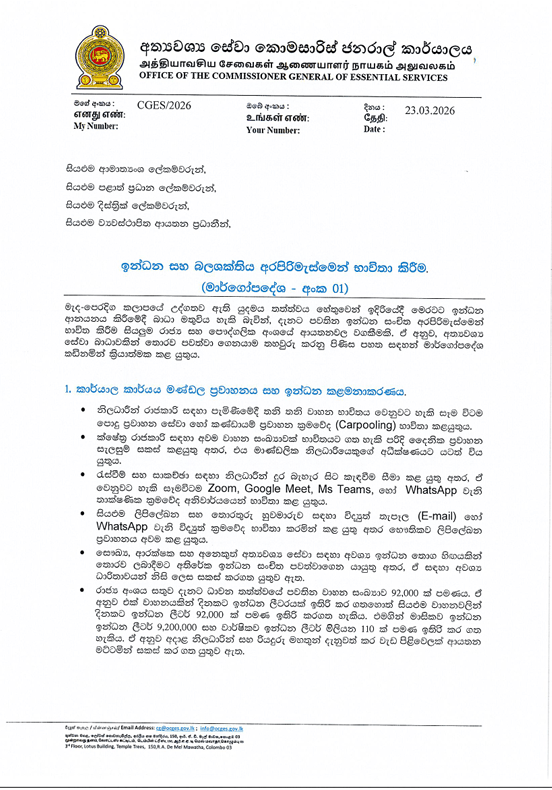 මෙම උපදෙස් මාලාව මඟින් රාජ්‍ය ආයතන ප්‍රධානීන් සහ නිලධාරීන් ඉන්ධන පරිභෝජනය කළමනාකරණය කළ යුතු ආකාරය පිළිබඳ පැහැදිලි මඟපෙන්වීමක් සපයයි.