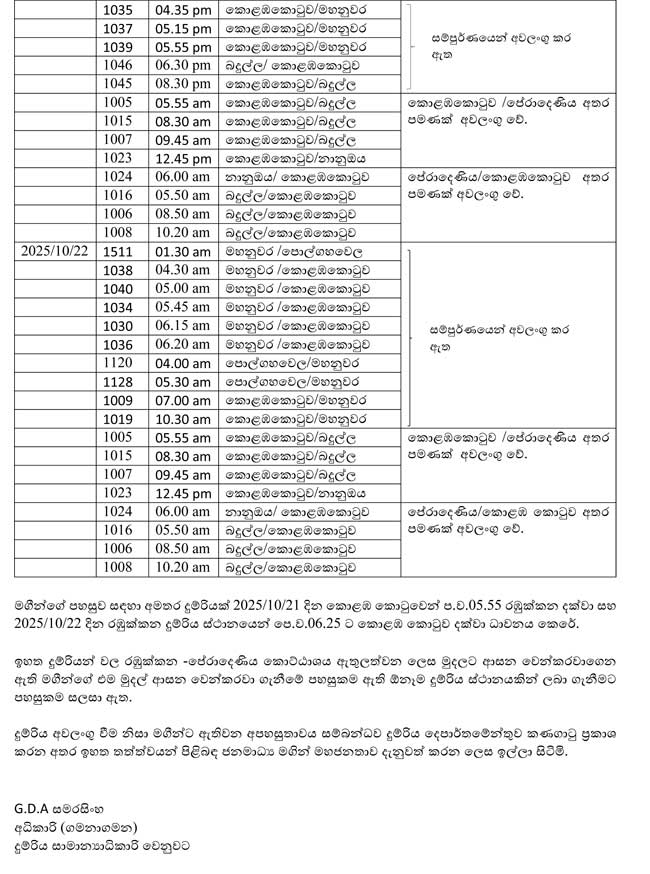 ඒ අනුව, කොළඹ කොටුව දුම්රිය ස්ථානයේ සිට බදුල්ල හා නානුඔය බලා ධාවනයට නියමිත වූ දුම්රිය ගමන් වාර 4 ක්, මහනුවර දුම්රිය ස්ථානයෙන් සිට ගමන් ආරම්භ කිරීමට කටයුතු යොදා ඇත.