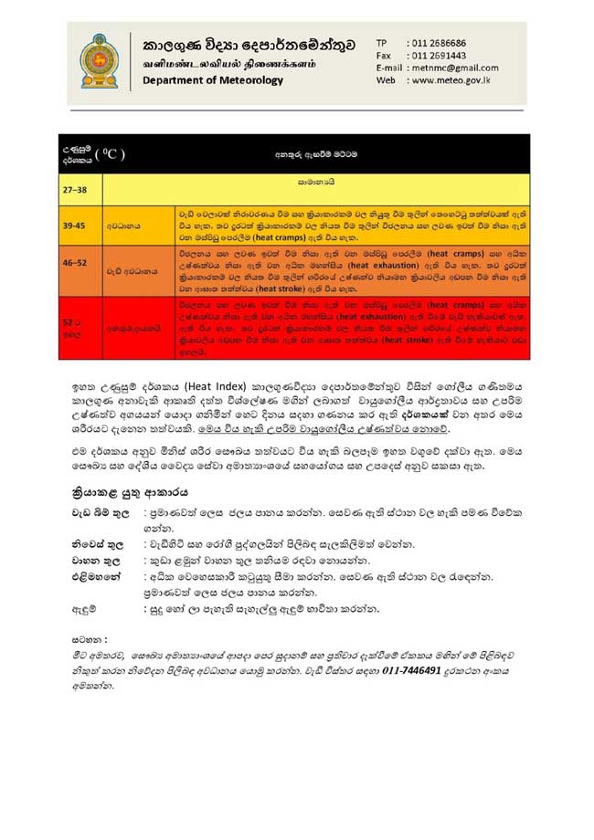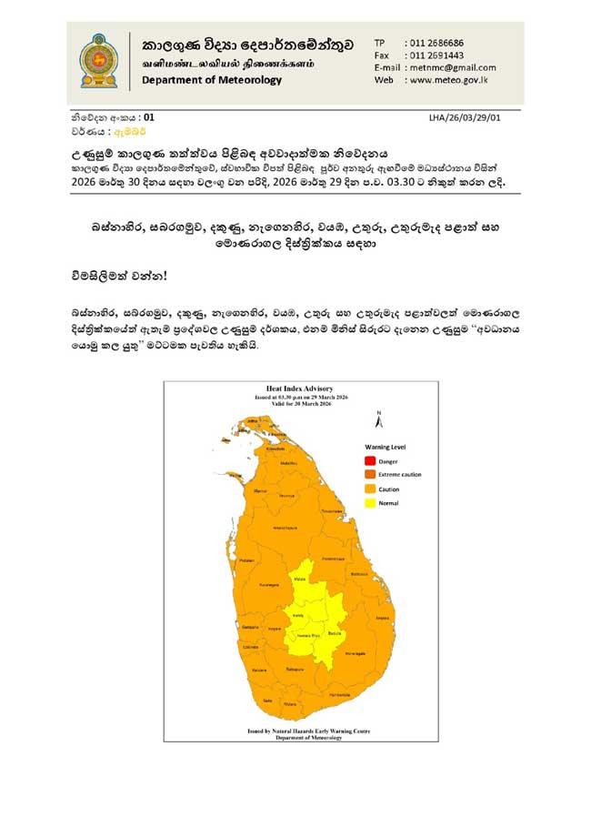 හෙට (30 ) දිනයේ බස්නාහිර, සබරගමුව, දකුණු, නැගෙනහිර, වයඹ, උතුරු සහ උතුරු මැද පළාත්වලත් මොනරාගල දිස්ත්රික්කයේත් ඇතැම් ප්රදේශවල උණුසුම් දර්ශකය, එනම් මිනිස් සිරුරට දැනෙන උණුසුම ”අවධානය යොමු කල යුතු” මට්ටමක පැවතිය හැකි බව දැනුම් දී තිබේ.