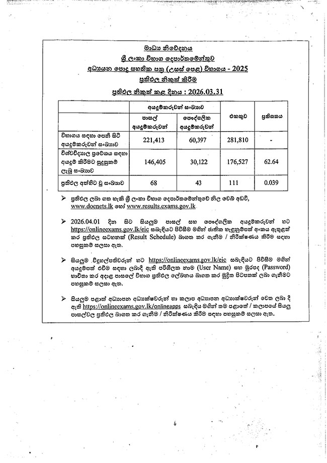 ඒ අනුව විභාග දෙපාර්තමේන්තුවේ නිල වෙබ් අඩවි වන https://www.doenets.lk/ සහ http://www.results.exams.gov.lk/ යන වෙබ් අඩවිවලට පිවිසීමෙන් ප්‍රතිඵල ලබාගත හැකිය.