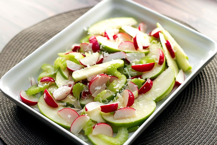 කොළ ඇපල් සහ රතු ඇපල් දෙවර්ගයම එකතු කර ගැනීමෙන් වැඩි රසයක් එකතු කර ගත හැකියි. උත්සව අවස්තාවන් සඳහා ඉතාමත් සුදුසු මෙම සළාදය සකසා බලන්න අමතක කරන්න එපා.