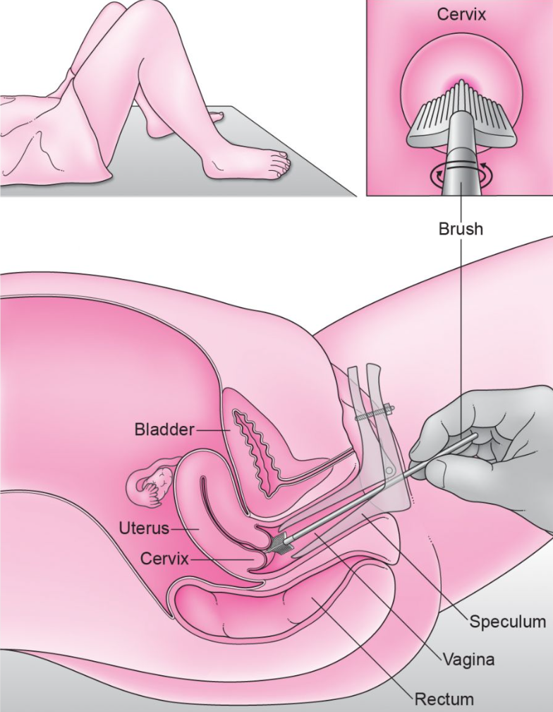 මෙය යෝනි පරික්ෂාවකි. Spculum නමැති උපකරණය යෝනි මාර්ගය තුලට ඇතුලු කර ,ගැබ්ගෙල බුරුසුවකින් පිහිදා සෛල ලබාගනු ලැබේ .මේවා අන්වීක්ෂයෙන් පසුව පරික්ෂා කෙරේ. මෙම සෛල වර්ණ ගන්වන ක්රම (staining) දෙකකි. පැරණි පරීක්ෂණය Papanicolaou stain ලෙස හැදින්වේ. නවතම Liqiud base cytology ක්රමය වඩා නිරවද්ය වේ.