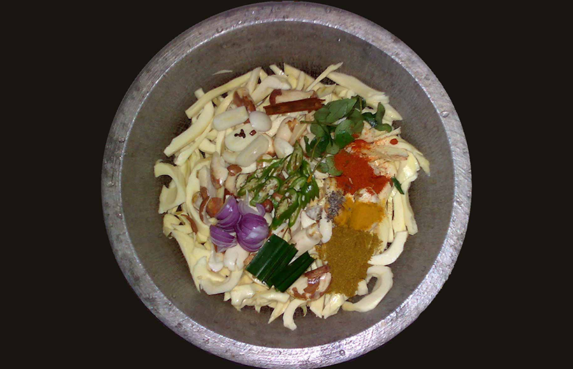 පිරිසුදු කරගත් කොස් ඇට හොඳින් තැම්බීමට ඇතිලියේ මැදටම දමන්න. යටින් සහ උඩින් මදුළු අතුරන්න.ලුණු කුඩු, මිරිස් කුඩු ස්වල්පයක්, කහකුඩු ස්වල්පයක්, අමු තුනපහ කුඩු ස්වල්පයක්, කුරුඳු පොතු කැබැල්ලක්, කරපිංචා, රම්පෙ, කැමති හැඩයට කපන ලද අමු මිරිස්, රතු ළුණු එකතු කර තැම්බෙන්නට ප්රමාණවත් ලෙස වතුර දමා මුඩියකින් වසා ලිප තබන්න.වතුර කොස් කැබලි මට්ටමට වඩා අඩුවෙන් දමන්න.එවිට වතුර රත් වීමෙන් සහ හුමාලයෙන් තැම්බෙන්නට පටන් ගනී.