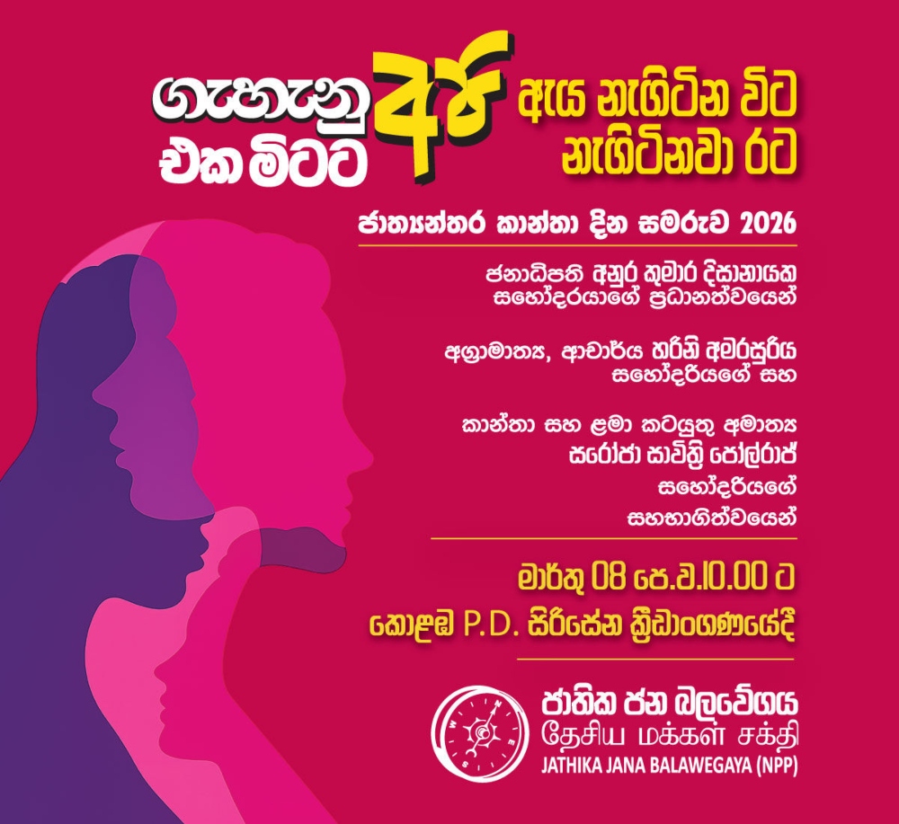 ‘ගැහැනු අපි එක මිටට, ඇය නැඟිටින විට, නැඟිටිනවා රට’ තේමා කරගෙන 2026 කාන්තා දින සැමරුම කොළඹ පී.ඩී. සිරිසේන ක්රිඩාංගණයේදී ජනාධිපති අනුර කුමාර දිසානායක මහතාගේ ප්රධානත්වයෙන් ලබන අද පෙරවරු 10.00ට පැවැත්වේ.