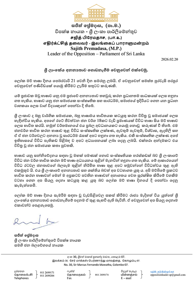ජාත්‍යන්තර මව් භාෂා දිනය වෙනුවෙන් නිවේදනයක් නිකුත්කරමින් විපක්ෂ නායක සජිත් ප්‍රේමදාස මහතා සඳහන් කරන්නේ, ශ්‍රී ලාංකේය අනන්‍යතාව ගොඩනැගීම සඳහා සියලුදෙනා එක්ව කටයුතු කළ යුතු බවය.