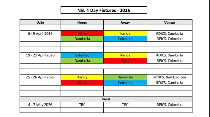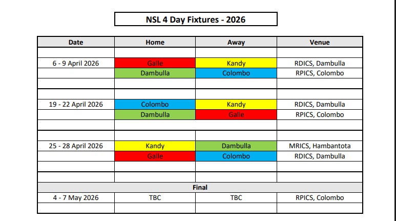 ශ්‍රී ලංකා ක්‍රිකට් ආයතනය මෙහෙයවන විශේෂ ජාතික සිව් දින තරගාවලිය කණ්ඩායම් හතරක් අතර පැවත්වීමට කටයුතු යොදා තිබෙන අතර එය අප්‍රේල් 6 වන දා ආරම්භ කිරීමට නියමිතයි.අප්‍රේල් 6 වන දා තරගාවලිය අරඹමින් ගාල්ල සහ මහනුවර කණ්ඩායම් අතර තරගය දඹුල්ල රන්ගිරි ජාත්‍යන්තර ක්‍රීඩාංගණයේදී ආරම්භ වන අතර එම තරගය මෙන්ම 6 වන දා සිට 9 වන දා දක්වා වන අනෙක් තරගය පැවත්වෙන්නේ ආර් ප්‍රේමදාස ජාත්‍යන්තර ක්‍රීඩාංගණයේදී ය.එහිදී මුණ ගැසීමට නියමිත කණ්ඩායම් දෙක වන්නේ කොළඹ සහ දඹුල්ල කණ්ඩායමයි.