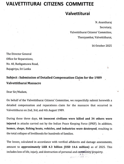 වැල්වැටිතුරේ පුරවැසි කමිටුවේ ලේකම් එන්. ආන්අන්තරාජ් විසින් ඔක්තෝබර් 16, 2025 දින රුපියල් බිලියන 4.3 (ඇමෙරිකානු ඩොලර් මිලියන 14.6) වන්දි ඉල්ලා හානිපූර්ණ කාර්යාලයේ අධ්‍යක්ෂක ජෙනරාල්ට ඉදිරිපත් කළ පැමිණිල්ල සූකාගේ ආයතනය විසින් දකුණු අප්‍රිකාවේ ජොහැනස්බර්ග් නුවර සිට ඔක්තෝබර් 17, 2025 නිකුත් කළ නිවේදනයකට එකතු කර තිබීම අවධාරණය කරන්නේ ශ්‍රී ලංකාවට එරෙහි මෙහෙයුම පුළුල් කර ඇති බවයි. එනම් ඉන්දියාවත් පළමුවරට ඉලක්කයක් වී ඇති බවයි. සමස්ත ක්‍රියාවලිය තුළ අවධාරණය කළ යුතු විශේෂ කරුණක් ඇත. සූකාගේ කණ්ඩායම කළ ඇස්තමේන්තුව අනුව 2025 මැයි 1 වන දිනට ගණනය කළ හානිය රුපියල් බිලියන 4.5 කි (ඇමෙරිකානු ඩොලර් මිලියන 15.1 කි) හානිපූරණය සඳහා වන කාර්යාලය යනු ශ්‍රී ලංකාවේ හානිපූරණ රෙජීමය කළමනාකරණය කිරීම හා අර්බුද හේතුවෙන් පීඩාවට පත් වූවන් හට හානිපූරණයන් ප්‍රදානය කරනු වස් 2018 අංක 34 දරන හානිපූරණය සඳහා වන කාර්යාලය පනත මඟින් ස්ථාපිත කරනු ලැබූ ස්වාධීන ආයතනයකි.
