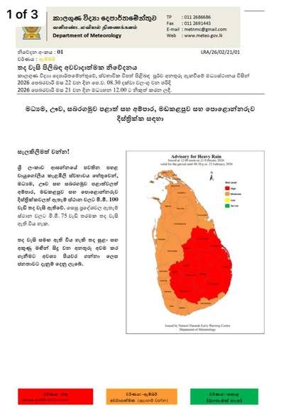 කාලගුණ විද්යා දෙපාර්තමේන්තුව විසින් 2026 පෙබරවාරි 22 දින පෙරවරු 08.30 දක්වා වලංගු වන පරිදි තද වැසි පිළිබඳ අවවාදාත්මක නිවේදනයක් නිකුත් කර ඇත.