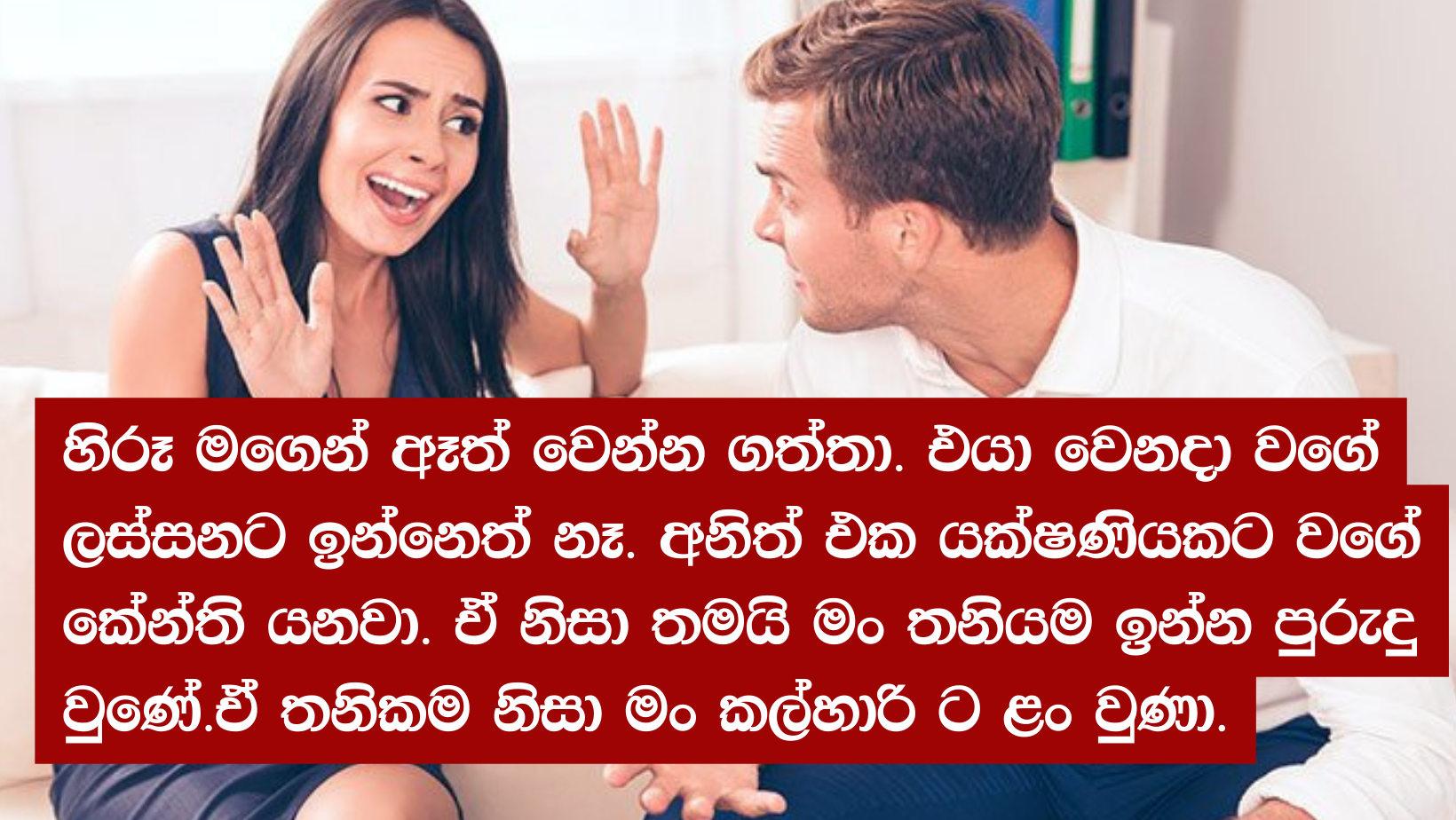 හිරුණි එහෙම අහමින් හඬන්නට ගත්තා. ඇයට දික්කසාදය අවශ්‍ය බව කිව්වත් ඔවුන්ගේ ළඟම මිතුරු යුවළක් උපදේශනයට පිවිසෙන්නට ඔවුන්ට උපදෙස් ලබා දුන්නා. උන් මා වෙත පැමිණෙන්නේ ඒ අනුවයි.