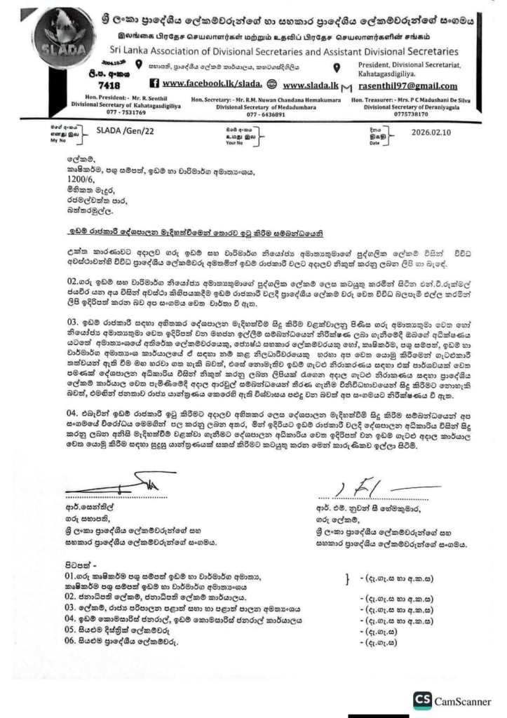 ඉඩම් රාජකාරී ඉටු කිරීමට අදාළව සිදුකරන අහිතකර දේශපාලන මැදිහත්වීම් සම්බන්ධයෙන් සිය විරෝධය පළ කරන බව ශ්‍රී ලංකා ප්‍රාදේශීය ලේකම්වරුන්ගේ හා සහකාර ප්‍රාදේශීය ලේකම්වරුන්ගේ සංගමය පවසයි.