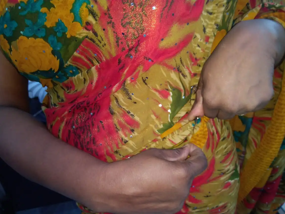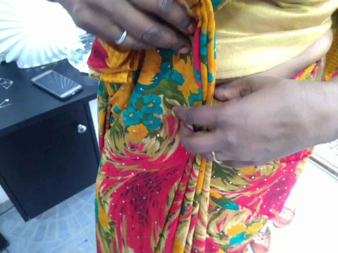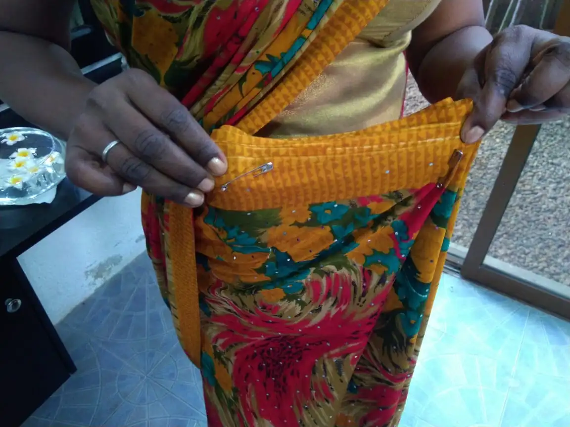 3.පලවෙනි රැල්ල ලොකුවටත් (බඩේ මැදින්) ඉන්පසු අවානක් ලෙස රැළි නවා ගන්න.රැලි වල දෙපැත්තෙන්ම මුලින් පින් එකක් ගසා ගන්න. ඉතුරු රැලිද එයට සම්බන්ධ කර ගන්න.උඩ අතට තියෙන විදියට රැලි තබා ගන්න. ඒ පින් එක ගලවා වීඩියෝ එකේ පරිදි ගසා ගන්න.ඉන්පසු ඉතුරු ටික එක රැල්ලක් ආකාරයට උඩ අතට උඩට එන ලෙස තබා ගන්න.ප්ලීට් එකද ඇඟේ හැඩය එන ලෙස සකසා පින් එකක් ගසා ගන්න.ඉන්පසු දකුණු කකුල ඉදිරියෙන් තබා රැළි ටික උවමනා ප්රමාණයට සකසා ගන්න.එය නීට් එකට තමන්ට උවමනා ප්රමාණයට සකසා පින් එකක් ගසා ගන්න. ගුලි නොගැසෙන ලෙස ඉනෙන් ගසා ගන්න.රැලි වල මැද හරියට ද පින් එකක් ගසා ගන්න.