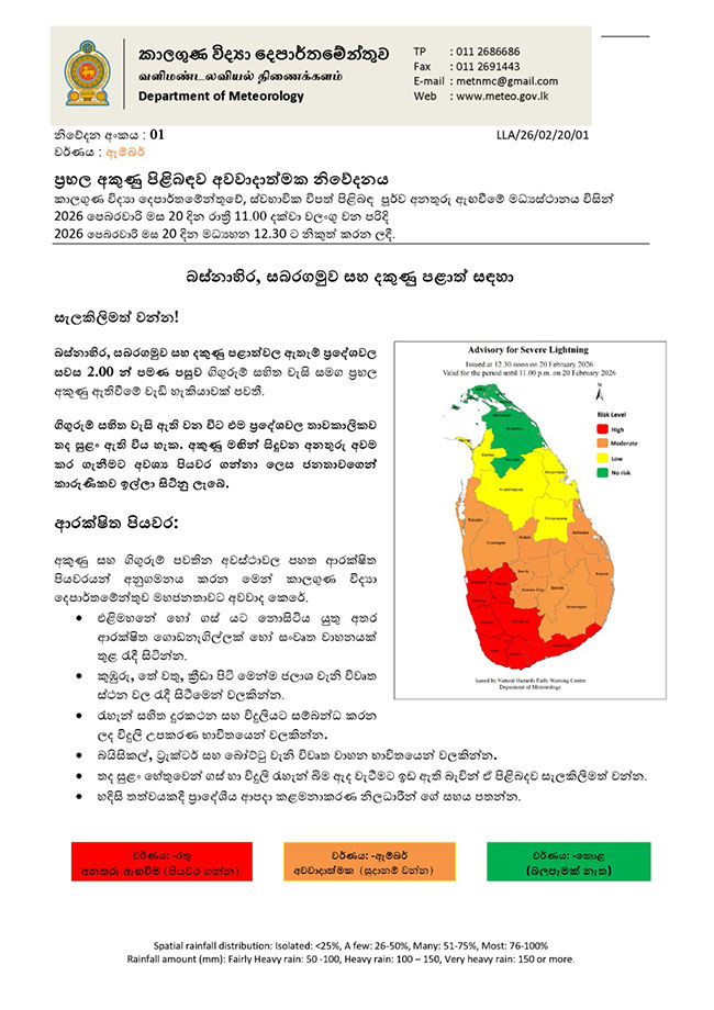 බස්නාහිර, සබරගමුව සහ දකුණු පළාත්වල ඇතැම් ප්‍රදේශවල සවස 02.00න් පසුව ගිගුරුම් සහිත වැසි සමග ප්‍රබල අකුණු ඇතිවීමේ හැකියාවක් පවතින බව කාලගුණ විද්‍යා දෙපාර්තමේන්තුව සඳහන් කර ඇත.