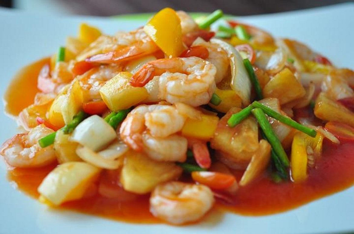 ප්‍රෝන්ස් සැලඩ් සමග ස්වීට් ඇන්ඩ් සවර් සෝස්