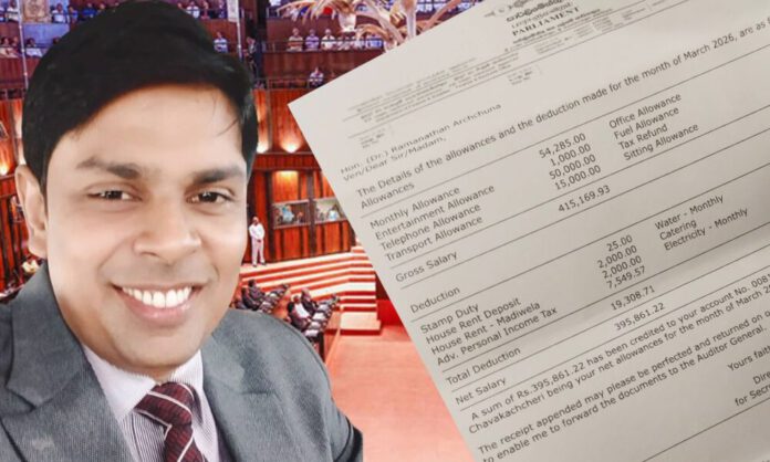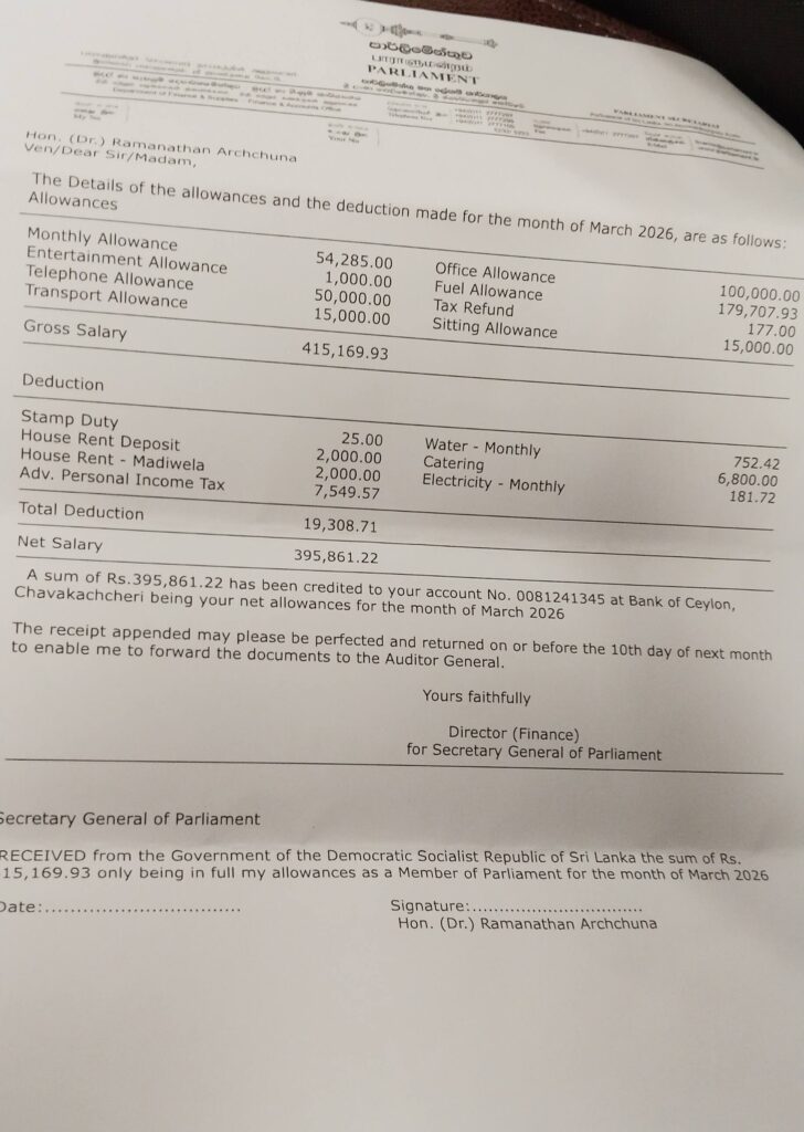 පාර්ලිමේන්තු මන්ත්රී වෛද්ය රාමනාදන් අර්ච්චුනා මහතා විසින් තම වැටුප් වාර්තාවක් සමාජ මාධ්යයට එක්කර තිබේ.