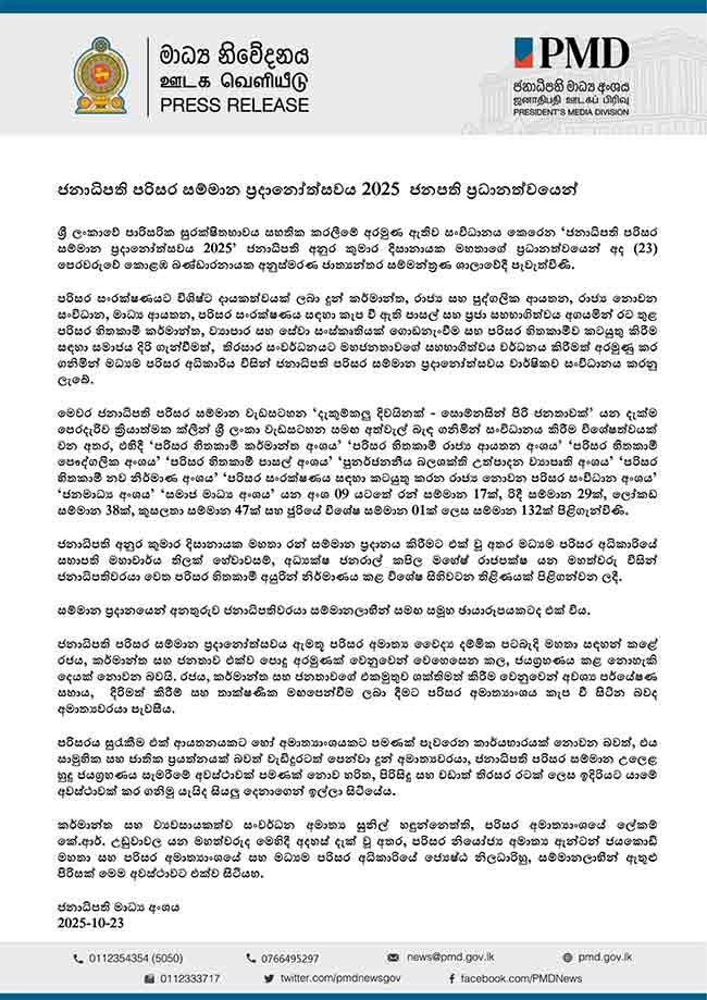 පරිසර අමාත්යාංශය විසින් සංවිධානය කරන ලද ” ජනාධිපති පරිසර සම්මාන උලෙළ ” අද පෙරවරුවේ කොළඹ බණ්ඩාරනායක අනුස්මරණ ජාත්යන්තර සම්මන්ත්රණ ශාලාවේදී පැවැත්විණි.