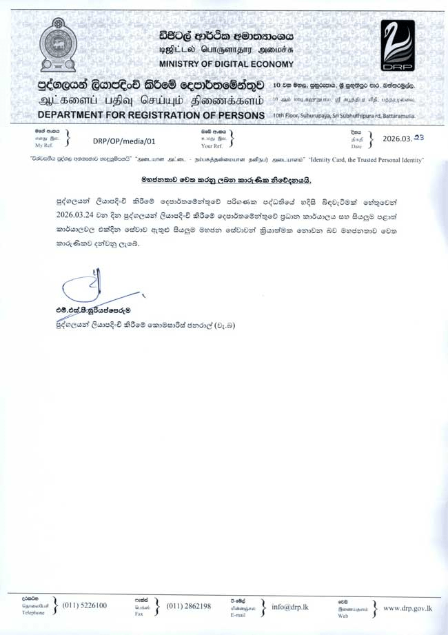 The post පුද්ගලයින් ලියාපදිංචි කිරීමේ දෙපාර්තමේන්තුවේ පරිගණක පද්ධතිය හදිසියේ බිඳවැටෙයි. සියලු සේවාවන් නවතී appeared first on LNW Sinhala.