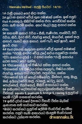 method කිහිපයක් තියෙනවා.කන බොන එක.නිදාගන්න එක. ව්යායාම කරන එක.භාවනා කරන එක.වතුර බොන එක.කවුරුහරි මේක මුලින්ම පටන් ගන්නවනම් පටන් ගන්න ඕන ලේසිම එකෙන්.මේක ඩයට් plan එකක් නෙවෙයි.ජීවන රටාවක්.diet plan එක්ක තියෙන්නෙ කන බොන ව්දිය විතරයි.කන බොන විදිය ගැන නෙවෙයි අපි කතා කරන්නෙ.ඒක එක පැත්තක් විතරයි.පළවෙනියට ලේසිම ක්රමය තමයි කන්න පැය බාගෙකට කලින් වතුර වීදුරුවක් බොන එක.මොනාහරි දෙයක් කන්න පැය බාගෙකට කලින් වතුර වීදුරුවක් බොන එක.කාලා ඉවර වෙලා අයෙ පැය බාගයක් යනකම් වතුර බොන්න එපා.පැය බාගයකින් පස්සෙ තමයි ආපහු වතුර බොන්න ඕනේ.මේකෙ sceinstific base එකක් තියෙනව.research කරලා තියෙනවා.එක research එකක පෙන්නලා තියෙනවා එහෙම කරපුවම ඉක්මනට බර අඩුවෙනවා කියලා. තව හේතුවක් තමයි හුගක් වෙලාවට වතුර තිබහයි බඩගින්නයි මිනිස්සු මාරු කරගන්නවා.අවශ්ය ප්රමාණයට වතුර බොන්නෙ නැහැ.ඒ වෙනුව්ටත් ඒ ගොල්ලො කිරි තේ,පැණි බීම කිරි පැකට් වගේ දේවල් බොනවා.ඊට කලින් වතුර වීදුරුවක් බිව්වට පස්සෙ ඒ අවශ්යතාවය නැති වෙලා යනවා.වතුර බොන එක අපේ බඩවැල්වලටත් හොදයි.විජලනය අඩු වෙනවා.කන්න පුලුවන් ප්රමාණය යම් තරමකට සීමා වෙනව.පලවෙනි පියවර ඒකතමයි. දෙවෙනියට කරන්න පුලුවන් ලේසිම එක තමයි,හුඟක් අය බර අඩු කරගන්න එන්නෙ දියවැඩියාව කොලොස්ටරෝල් වගේ ලෙඩ නිසා.ඕවට කියන්නෙ කෑමෙන් පරිස්සම් වෙන්න වැඩිය ව්යායාම කරන්න කියලනේ.නමුත් අපි කියන්නෙ අපේ ප්රධානම එක තමයි අඩුවෙන් කන්න එපා කනකොට බඩ පිරෙන්න කන්න කියලා.අනිත් එක තමයි ගොඩක් ව්යායාම කරන්න එපා පොඩ්ඩක් ව්යායාම කරන්න කියලා.එතකොට ඒක හරි ලේසියි.අපි මුලු සතියටම ව්යායාම කරන්නෙ විනාඩි 40යි.සතියටම 40යි කියන්නෙ විනාඩි 20 ඒවා දෙකයි මුලු සතියටම කරන්න ඕනේ. වෙනම workout එකක් තියෙන්වා design කරලා.එක කරන්න පුලුවන්.ඒකේ අවුරුදු 65 එක්කෙනෙකුට වුනත් කරන්න පුලුවන් ලේසි version තියෙනවා. Athletic කරන කෙනෙකුට වුනත් කරන්න පුලුවන් අමාරු version තියෙනවා.එකම time එකේ.ජිම් එකට යන්න අවශ්ය නැහැ.අතපය හතරයි මහපොළවයි උපයෝගී කරගෙන තමන්ම මේ ව්යායාම කරන්න පුලුවන් .
