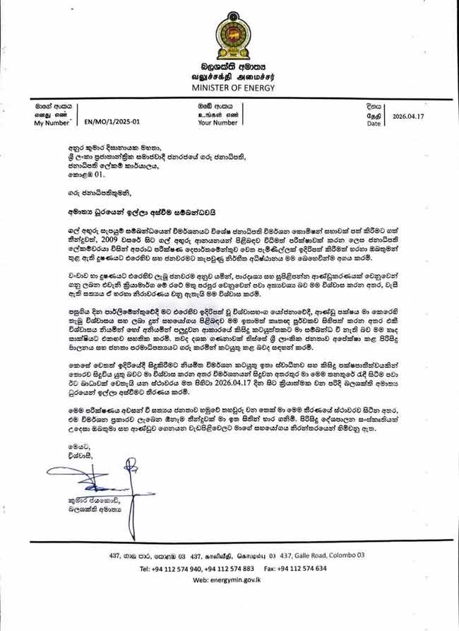 කෙසේ වෙතත් ඉදිරියේදී සිදුකිරීමට නියමිත විමර්ශන කටයුතු ඉතා ස්වාධීනව සහ කිසිදු පක්ෂපාතීත්වයකින් තොරව සිදුවිය යුතු බවට මා විශ්වාස කරන අතර විමර්ශනයන් සිදුවන අතරේ මම මෙම තනතුරේ සිටීම පවා ඊට බාධාවක් වෙතැයි යන ස්ථාවර මත පිහිටා වහාම ක්‍රියාත්මක වන පරිදි 2026 .04 .17 දින බලශක්ති අමාත්‍ය ධුරයෙන් ඉල්ලා අස්වීමට තීරණය කරමි.