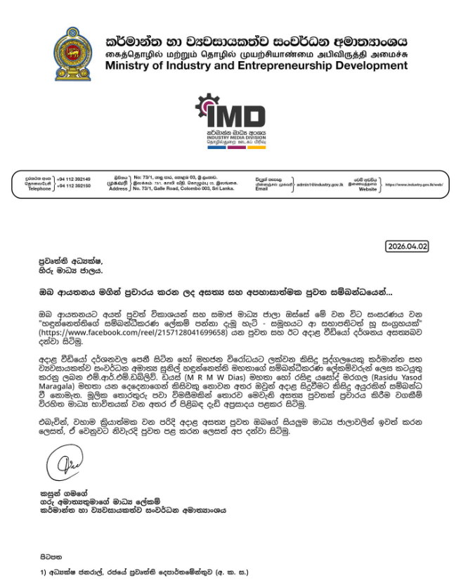 අදාළ වීඩියෝ දර්ශනවල පෙනී සිටින හෝ මහජන විරෝධයට ලක්වන කිසිදු පුද්ගලයෙකු කර්මාන්ත සහ ව්යවසායකත්ව සංවර්ධන අමාත්ය සුනිල් හඳුන්නෙත්ති මහතාගේ සම්බන්ධීකරණ ලේකම්වරුන් ලෙස කටයුතු කරනු ලබන එම්.ආර්.එම්.ඩබ්ලිව්. ඩයස් (M R M W Dias) මහතා හෝ රසිඳු යසෝද් මරගල (Rasidu Yasod Maragala) මහතා යන දෙදෙනාගෙන් කිසිවකු නොවන බවයි අමාත්යවරයාගේ මාධ්ය ලේකම්වරයා විසින් නිකුත් කර ඇති නිවේදනයක දැක්වෙන්නේ.