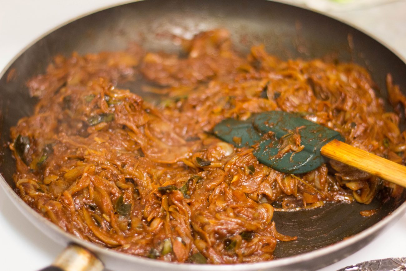 ළුණු ලියා රන්වන් පාට වනතුරු ගැඹුරු තෙලේ බදින්න. එය තෙල් බේරෙන්න පසෙකින් තබන්න. වෙනත් බඳුනකට තෙල් ටිකක් ලිප තබා රත්කර රම්පෙ, කරපිංචා, ඉඟුරු, සුදු ළුණු දමා බැද කරඳ මුංගු, කරාබු නැටි අවශ්ය නම් එකතු කරන්න.