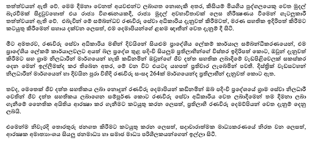 එම දීමනාව අත්හිටුවා ඇති බවට අසත්‍ය ප්‍රකාශයක් මේ වන විට ප්‍රචාරණය වන අතර, එම තොරතුර සම්පුර්ණයෙන් සාවද්‍ය බවත් එම දීමනාව අත්හිටුවීමට රජය කිසිදු තීරණයක් ගෙන නොමැති බවත් ආරක්‍ෂක අමාත්‍යාංශය අවධාරණය කර සිටී.