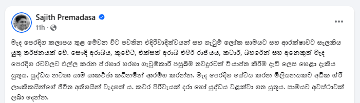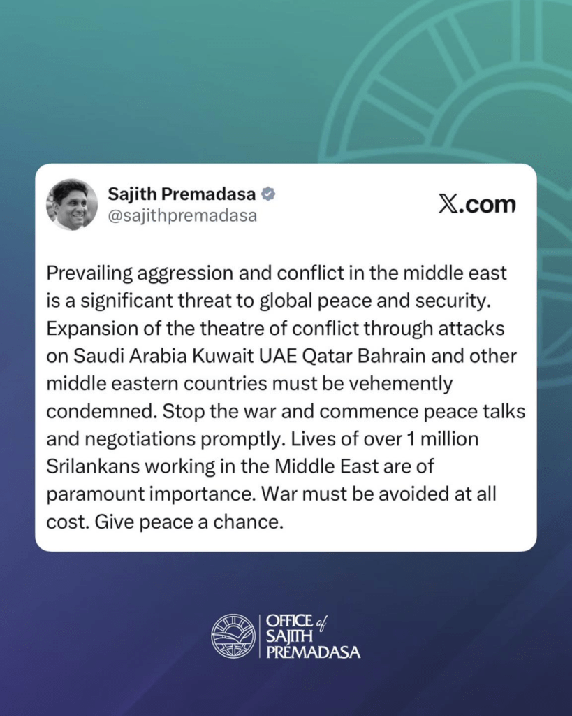 The post මැදපෙරදිග කලාපයේ ගැටුම් ලෝක සාමයට සහ ආරක්ෂාවට තර්ජනයක්. යුද්ධය නවතා වහාම සාකච්ඡා අරඹන්න – විපක්ෂ නායක සජිත් appeared first on LNW Sinhala.