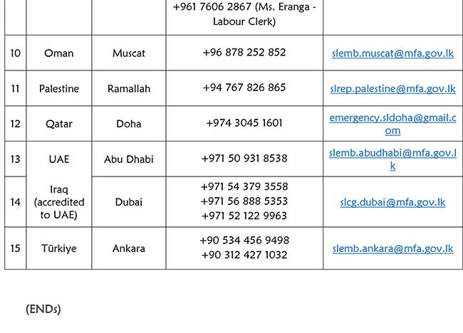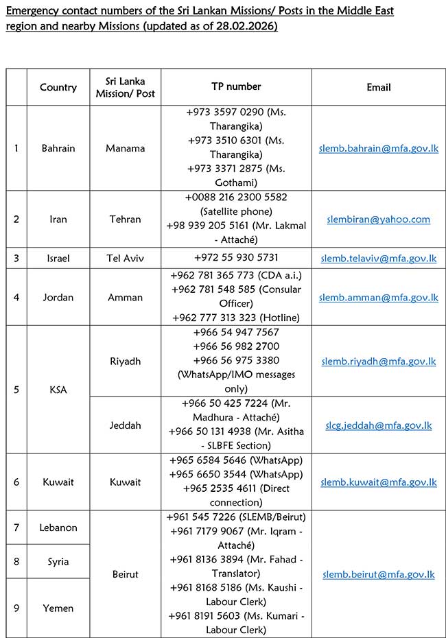 දේශීය පුවත් මැදපෙරදිග ගැටුම – විදේශ කටයුතු අමාත්යාංශයෙන් ලාංකිකයින්ට හදිසි දුරකථන අංක මාලාවක් By dilshan - March 1, 2026 0 2 FacebookTwitterPinterestWhatsApp මැදපෙරදිග කලාපයේ උග්රවන ගැටුම් හමුවේ, විදේශ කටයුතු අමාත්යාංශය ශ්රී ලාංකිකයන් සඳහා හදිසි දුරකථන අංක මාලාවක් නිකුත් කර ඇත. ඒ අනුව, මැදපෙරදිග පදිංචි ශ්රී ලාංකිකයින්ට පහත සඳහන් දුරකථන අංක භාවිතාකර තොරතුරු ලබා ගත හැකිය. Saru News