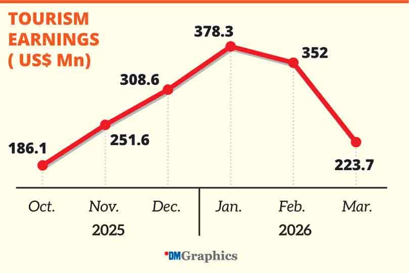 2026 මාර්තු මාසයේදී සංචාරක ව්යාපාරයෙන් ශ්රී ලංකාවේ විදේශ විනිමය ඉපැයීම් දැඩි පහරකට ලක් වූ අතර, එය සියයට 37 කින් පහත වැටී ඇමරිකානු ඩොලර් මිලියන 223.7 ක් විය.