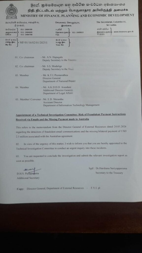 (ඇමුණුම – වංචාව සම්බන්ධයෙන් විමර්ශනය සඳහා පත් කළ Technical Investigation Committee හි පත්වීම් ලිපිය)
