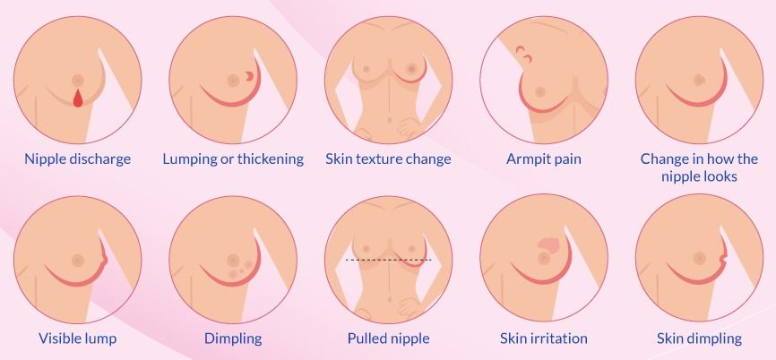 අනෙක් පිළිකා වර්ග වලට වඩා ඉක්මනින් සහ පහසුවෙන් පියයුරු පිළිකා හඳුනා ගන්න ඔබට පුළුවන් නිසා පියයුරු ආශ්‍රිතව ඇතිවෙන පහත සඳහන් පියයුරු පිළිකා වල රෝග ලක්ෂණ ගැන ඉතාම සැළකිලිමත් වීම ගොඩක් වටිනව.