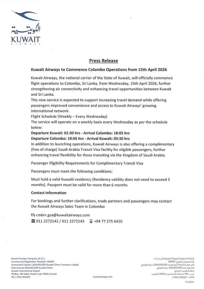මැදපෙරදිග යුධමය වාතාවරණය හේතුවෙන් මෙහෙයුම් නවතා තිබූ ‘කුවේට් එයාවේස්’ ගුවන්සේවය යළි කොළඹ දක්වා ගුවන්ගමන් ආරම්භ කරන බව සිවිල් ගුවන්සේවා අමාත්යාංශය අද (8) පස්වරුවේ නිවේදනය කළේය.