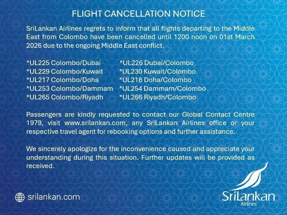 සියලුම මගීන්ගේ සහ කාර්ය මණ්ඩලයේ ආරක්ෂාව සහ යහපැවැත්ම සහතික කිරීම සඳහා කොළඹ සිට රියාද්, කුවේට්, දමාම්, ඩුබායි සහ දෝහා දක්වා සම්බන්ධ කරන ගුවන් ගමන් තාවකාලිකව නතර කර ඇති බව ජාතික ගුවන් සේවය තහවුරු කළේය.