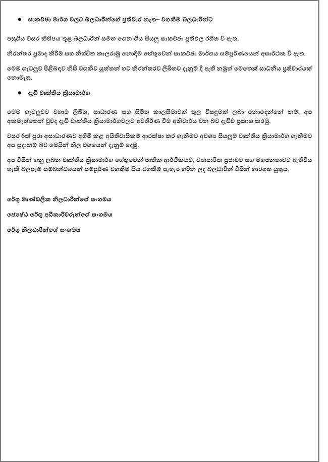 මෙම වෘත්තීය ක්රියාමාර්ගය හේතුවෙන් ජාතික ආර්ථිකයට, ව්යාපාරික ප්රජාවට හා මහජනතාවට ඇති විය හැකි බලපෑම් සම්බන්ධයෙන් සම්පූර්ණ වගකීම සිය වගකීම් පැහැර හරින ලද බලධාරීන් විසින් භාරගත යුතු බවද අදාළ නිවේදනයේ සඳහන් වේ.
