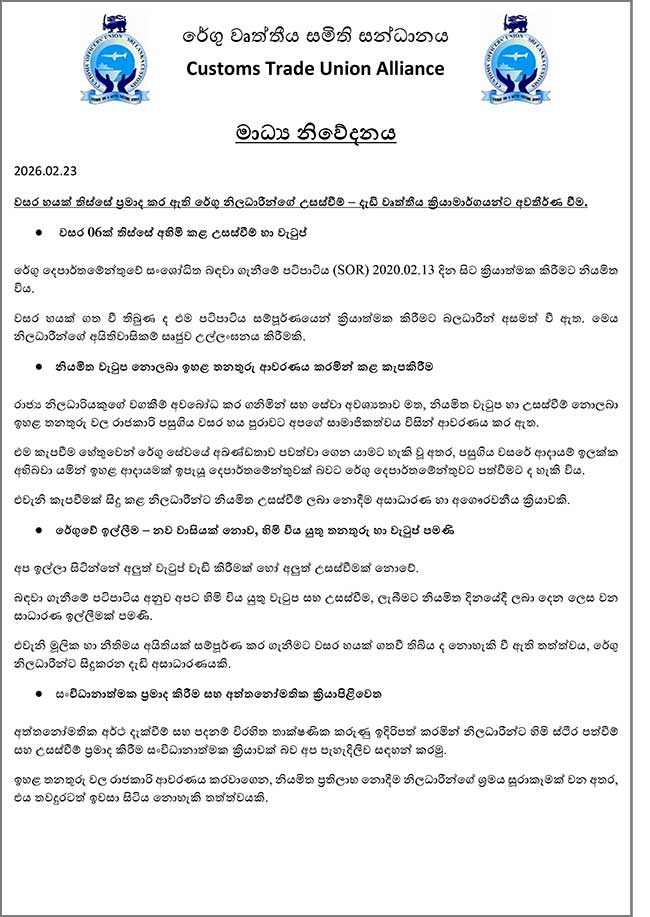 වසර 6ක් පුරා ප්රමාද කර ඇති රේගු නිලධාරීන්ගේ උසස්වීම් හා වැටුප් මෙන්ම තවත් ගැටලු කිහිපයක් සම්බන්ධයෙන් වහාම ලිඛිත, සාධාරණ විසඳුම් ලබා නොදෙන්නේ නම් අකමැත්තෙන් වුවද දැඩි වෘත්තීය ක්රියාමාර්ගයකට අවතීර්ණ වන බව රේගු වෘත්තීය සමිති සන්ධානය පවසයි.