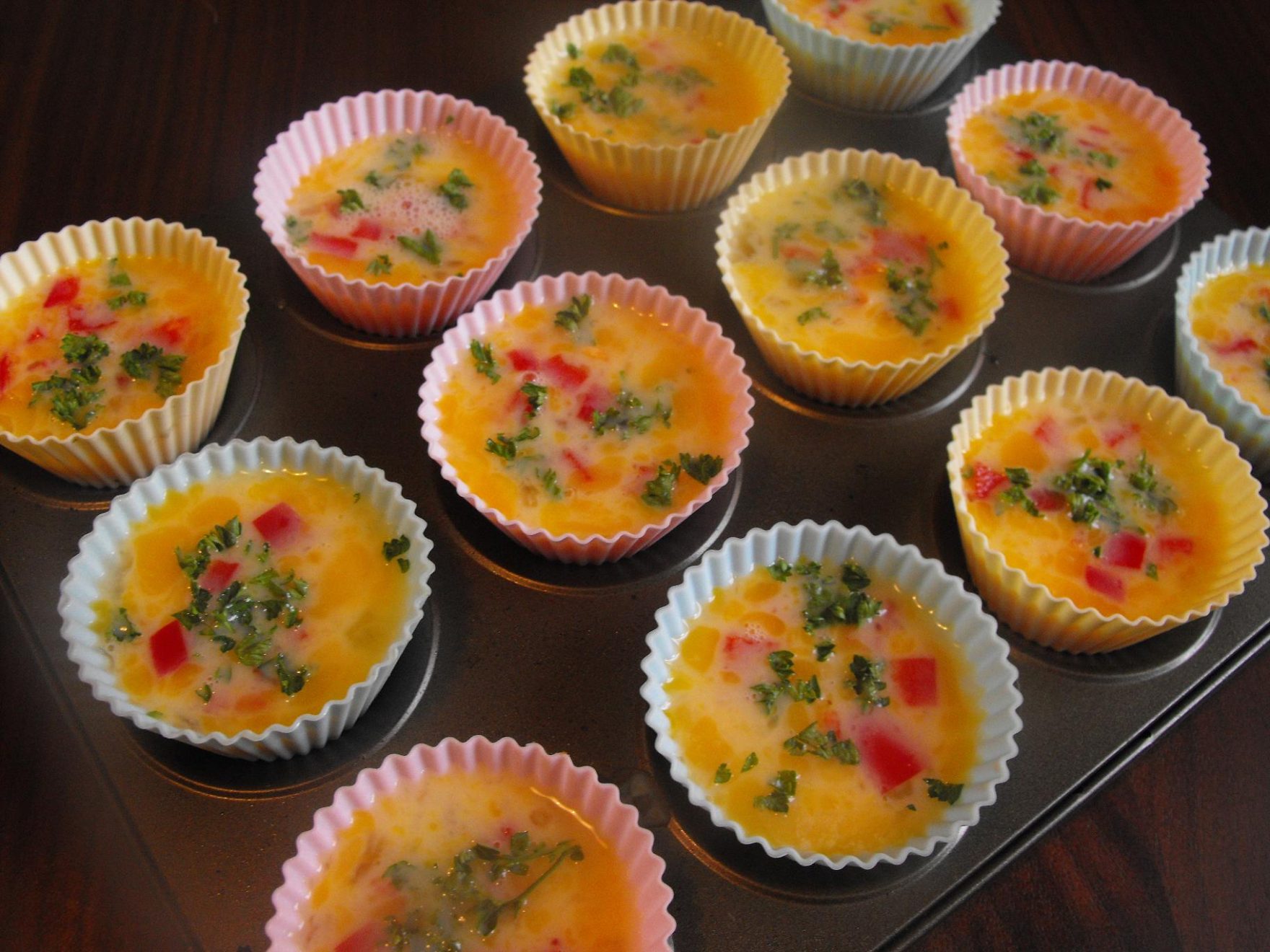 ලොකු භාජනයක් ගෙන එයට බිත්තර ටික දමා හොඳින් ගසාගන්න. ඉන්පසු එම බිත්තර මිශ්රණයට බෙල් පෙපර්, සොසේජ්, චීස්, ලුණු සහ ගම්මිරිස් එකතු කර හොඳින් මිශ්ර කරගන්න. Muffin cups හෝ muffin tray එකට බටර් ස්වල්පයක් තවරාගන්න. දැන් මිශ්රණය muffin tray එකට සමසේ වත්කරගන්න. උඩට ගාගත් චීස් ටිකක් ඉසින්න. අවන් එක අංශක 375ට රත් කරගෙන විනාඩි 15-18ක් පමණ බේක් කරගන්න. සකසාගත් Bell pepper egg muffins මත පාස්ලි තබා සරසාගන්න.