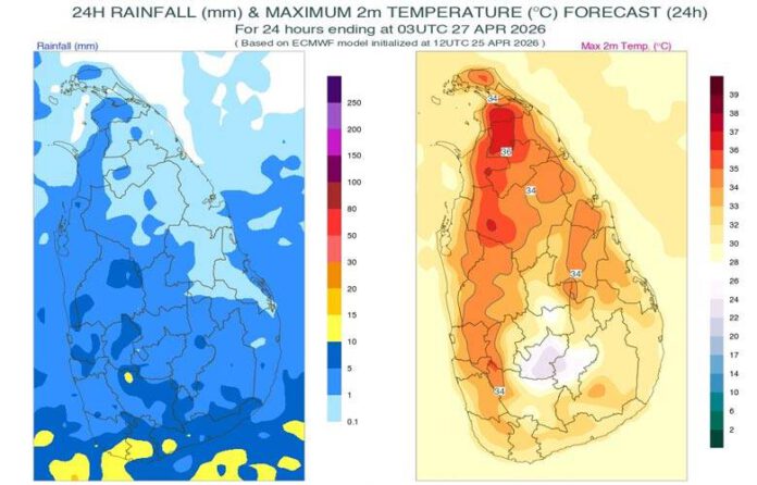 අද (අප්රේල් 26) දිනයේදී බස්නාහිර, සබරගමුව සහ වයඹ පළාත්වලත් ගාල්ල, මාතර, මහනුවර සහ නුවරඑළිය දිස්ත්රික්කවලත් ප. ව. 2.00 න් පසු තැනින් තැන වැසි හෝ ගිගුරුම් සහිත වැසි ඇතිවන බව කාලගුණ විද්යා දෙපාර්තමේන්තුව පවසයි.