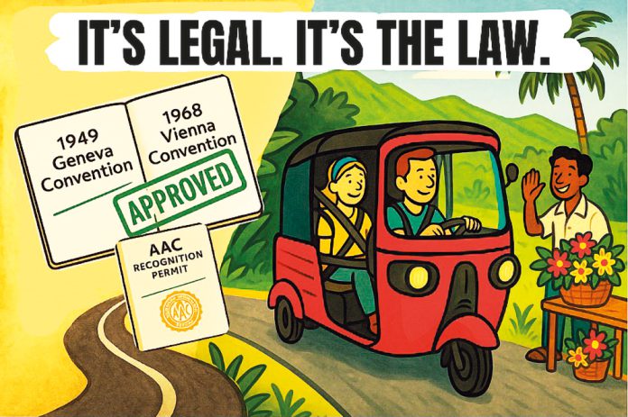 නීතිය පැහැදිලිය. ශ්රී ලංකාව 1951 ජූලි 26 වන දින මාර්ග ගමනාගමනය පිළිබඳ 1949 ජිනීවා සම්මුතිය අනුමත කළ අතර, ජාත්යන්තර රියදුරු බලපත්රය (IDP) පිළිගන්නා රටවල් 100 කට වැඩි ගණනකට එක් වී ඇත. එය 1958 නොවැම්බර් 28 වන දින අංක 11, 603 දරන අතිවිශේෂ ගැසට් පත්රය හරහා විධිමත් ලෙස ජාතික නීතියට අනුකූලව පනවන ලද්දකි. එමගින් රිය පැදවීමේ අයිතිවාසිකම් පිළිගැනීමට පූර්ණ දේශීය නීතිමය බලයක් ලබා ඇති අතර ශ්රී ලංකාව එම සම්මුතියේ මූලික මූලධර්මය ආරක්ෂා කිරීමට බැඳී සිටී. එක් රටක් රියදුරෙකු දක්ෂ ලෙස සලකනු ලැබූ පසු, එම නිපුණතාවයට අනෙක් සියල්ලන් විසින් ගරු කළ යුතුය.