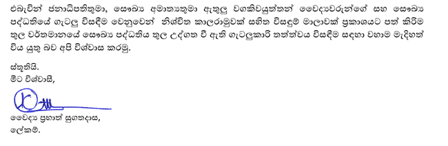 ජනාධිපතිවරයා, සෞඛ්‍ය ඇමති ඇතුළු වගකිවයුත්තන් වෛද්‍යවරුන්ගේ සහ සෞඛ්‍ය පද්ධතියේ ගැටලු විසඳීම වෙනුවෙන් නිශ්චිත කාලරාමුවක් සහිත විසඳුම් මාලාවක් ප්‍රකාශයට පත්කිරීම තුළ වර්තමානයේ සෞඛ්‍ය පද්ධතිය තුළ උද්ගත වී ඇති ගැටලුකාරී තත්ත්වය විසඳීමට වහාම මැදිහත් විය යුතු බවට තම සංගමය විශ්වාසය කරන බව ද අදාළ නිවේදනයේ දැක්වේ.
