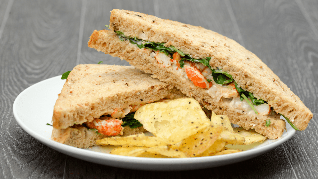 දැන් පාන් පෙතිවල බටර් තවරා ලූනු පෙති, තක්කාලි පෙති ,සලාද කොල අතුරා ඒ මතින් බැදගත් ඉස්සන් අතුරා සැන්විච් සකස් කරගන්න