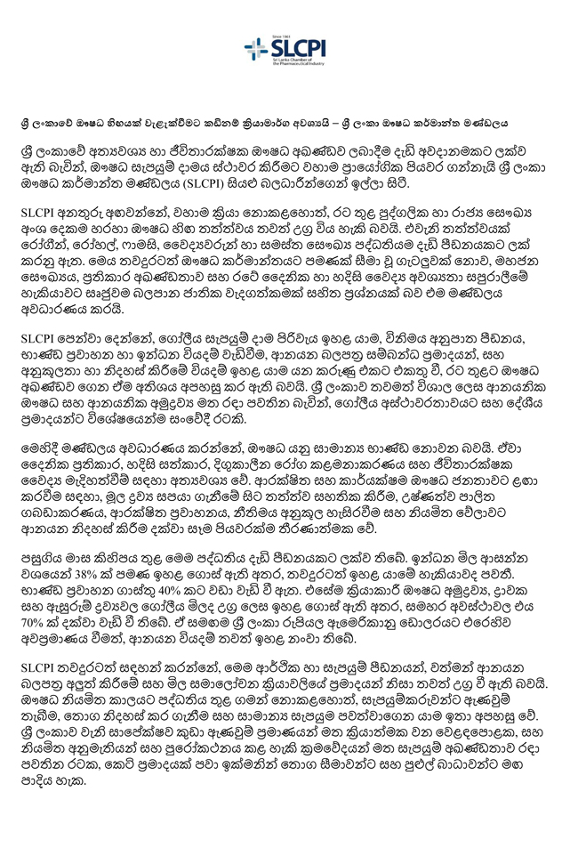 ශ්රී ලංකාවේ අත්යවශ්ය සහ ජීවිතාරක්ෂක ඖෂධ සැපයුම බරපතළ අනතුරකට ලක්ව ඇති බවත්, එය වළක්වා ගැනීමට වහාම ප්රායෝගික පියවර ගන්නා ලෙසත් ශ්රී ලංකා ඖෂධ කර්මාන්ත මණ්ඩලය (SLCPI) රජයෙන් සහ අදාළ බලධාරීන්ගෙන් ඉල්ලීමක් කරයි.